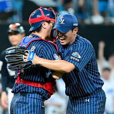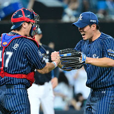 김재윤, '강민호와 개인 통산 190세이브 기쁨 나누며'