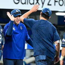 '포수 최초 350홈런' 강민호, '시원한 물세례 축하 받으며'