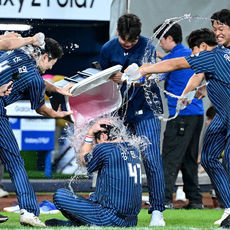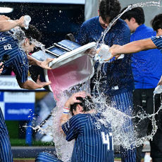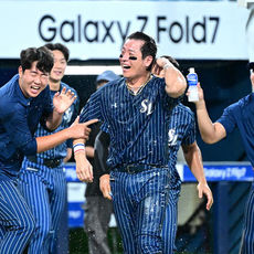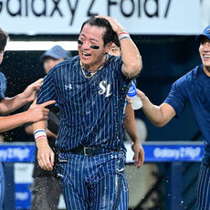 '포수 최초 350홈런' 강민호, '어마어마한 물세례'