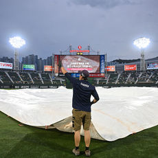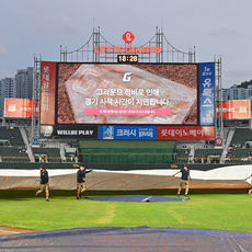 방수포 덮는 롯데 관계자들