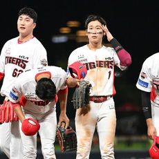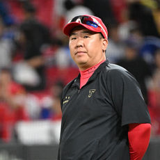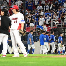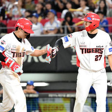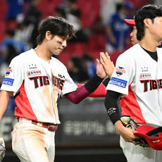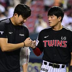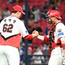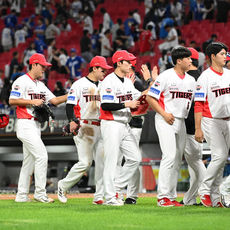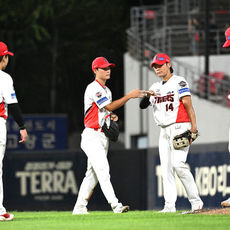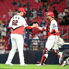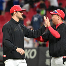 이범호 감독과 승리의 기쁨 나누는 박찬호