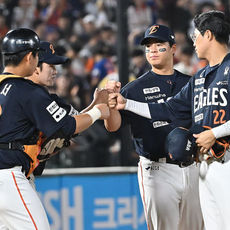 13-0 완승 하이파이브하는 김경문 감독과 한화 선수들