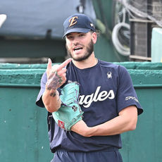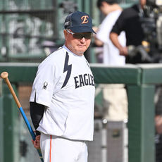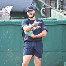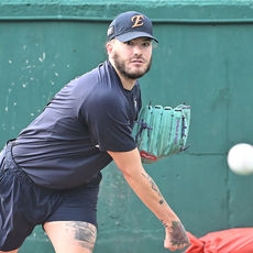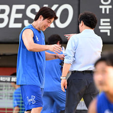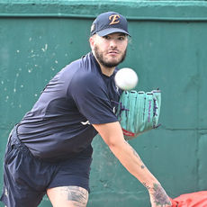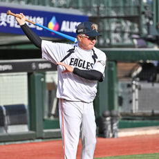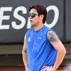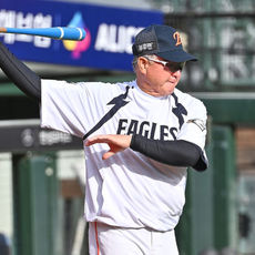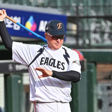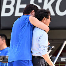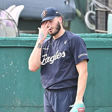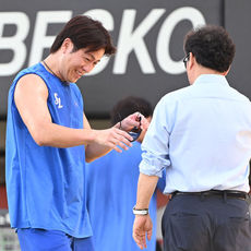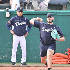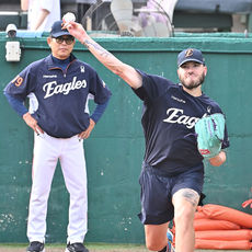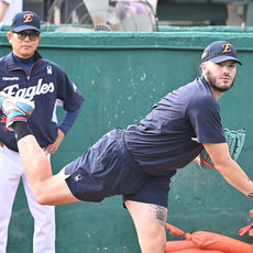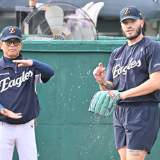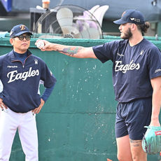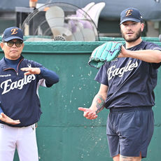 불펜 투구 내용에 대해 얘기하는 폰세와 양상문 코치