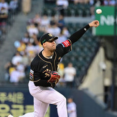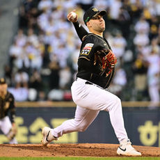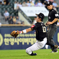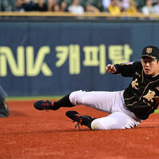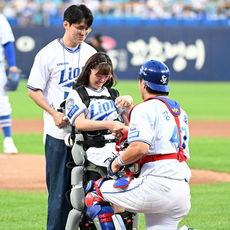 무릎 꿇고 기념구 전달한 강민호 향해 함박웃음 짓는 김예원 학생