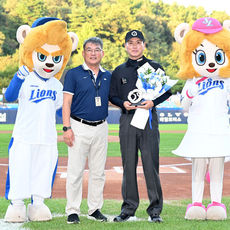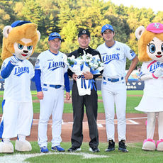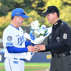 권영철 심판에게 꽃다발 건네는 박진만 감독
