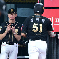장진혁 9회 솔로포에 박수 보내는 KT 이강철 감독