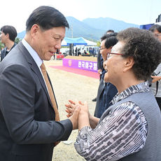 인사 나누는 허구연 KBO 총재와 고 최동원 선수의 어머니 김정자 여사