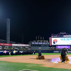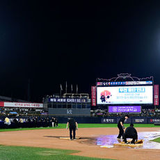 비 그친 수원 위즈파크, KT-LG 맞대결 재개 위해 그라운드 정비 시작