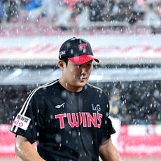장대비 맞으며 그라운드에서 철수하는 LG 선발 손주영