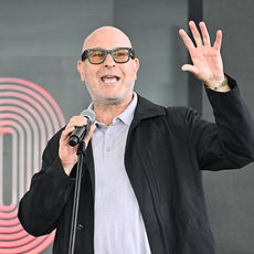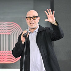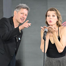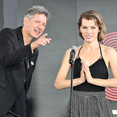 야외무대 인사하는 밀라 요보비치와 남편 폴 앤드슨 프로듀서