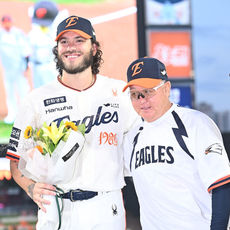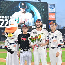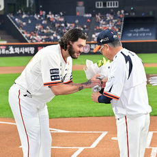 김경문 감독에게 꽃다발을 받는 폰세