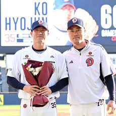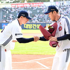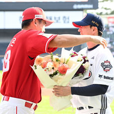 고효준에게 꽃다발 건네는 조성환 감독대행