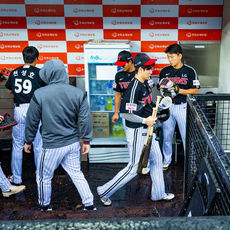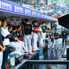 굵어진 빗줄기를 피하러 덕아웃으로 들어온 LG 선수들